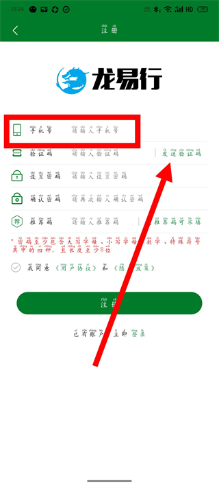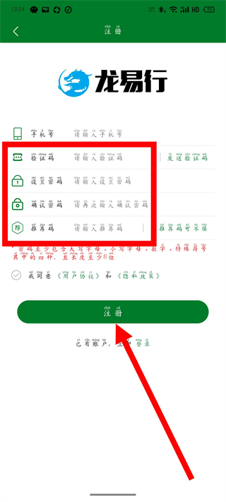 5、输入验证码和设置密码,勾选相关协议后,点击注册,完成账号注册。